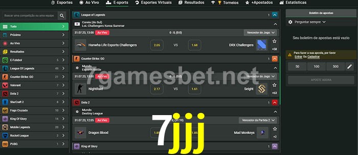 A aposta 7jjj oferece aos jogadores a experiência mais conveniente de apostas em eSports!